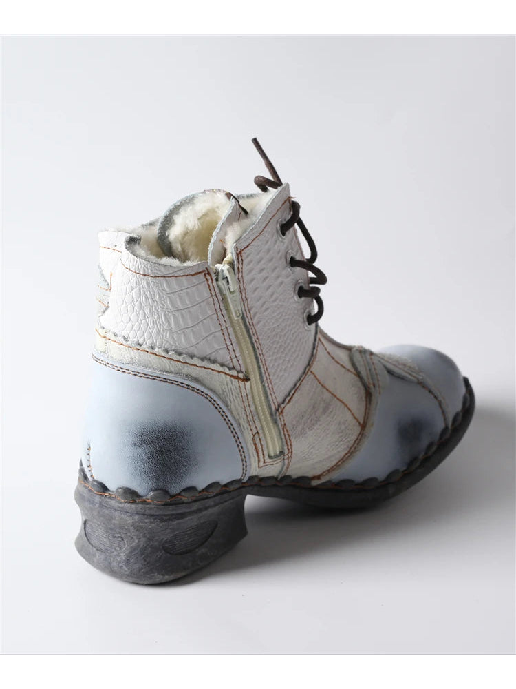 TMA EYES Patchwork Leather Ankle Boots Washed, Textured, Lace-Up Women's